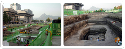 마치 역사의 현장에 가보는 순간이었다. 언제 이렇게 광화문 광장 지하토층을 살필 수 있겠는가. 물론 광장조성과정에서 발견한 토층과 유물을 복원해 전시하는 공간을 별도로 마련한다고 한다. 그러나 문화재 발굴현장 그대로의 모습을 공개한 시의 전격적인 결정은 역사문화를 갈구하는 시민고객들에게 적잖은 공감을 불러일으켰다고 생각한다. 광화문광장 문화재발굴 현장을 일반 시민에게 잠시 공개한다는 소식을 듣고 발굴 현장을 찾았다. 그간 통제구역이던 공사장의 문화재 발굴지역을 직접 확인한다는 자체가 처음부터 흥분됐다. 현장에서 일하는 인부들도 잠시 일손을 놓은 듯 뜻하지 않은 구경꾼들이 반가운 모양이다. 하긴 이때가 아니면 사람구경은 좀처럼 힘들 것이다. 이순신 장군 동상 밑에 조성되는 지하광장 쪽에서 역사의 궤적들이 발견됐다. 본래 광화문과 남대문 사이의 도로는 조선개국과 함께 관아가 있는 육조거리였다고 한다. 그러니까 그 이전은 인간의 손이 닿지 않은 자연토층인 셈이다.