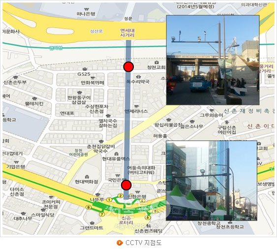서울시는 통행위반 차량을 단속하기 위하여 연세로 남쪽의 홍익문고앞과 북쪽의 창천교회앞에 각 2대씩, 총 4대의 고성능 무인단속 CCTV를 설치하였다. 단속자료는 경찰에 이관하여 조치될 예정이다.