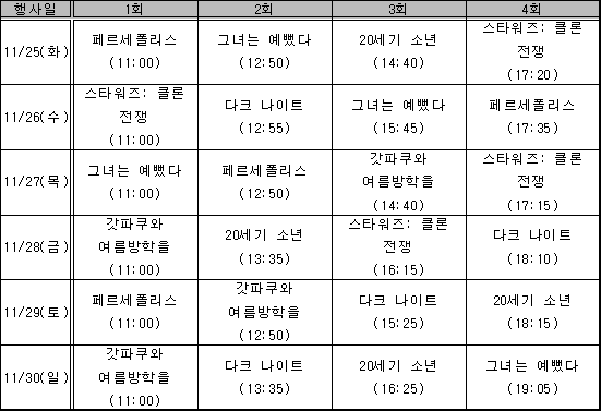 마지막 만화원작 영화는 배트맨 시리즈로 조커에 대한 이야기를 담고 있는 ‘다크 나이트’. 악당 ‘조커’로 분한 히스 레저의 갑작스런 사망 때문이 아니더라도 이 영화는 배트맨이라는 원작의 유명세, 탄탄한 이야기 구조와 배우들의 명연기, 어둡지만 아름다운 시각효과 등으로 올해 최고의 화제작으로 꼽힌다. 영화제 티켓은 맥스무비 사이트와 애니시네마 홈페이지에서 온라인 예매할 수 있으며, 영화제가 진행되는 해당 영화관 창구에서도 예매 및 현매가 가능하다. 상영기간 중 예매이벤트, 경품 추첨 이벤트, 50자평 이벤트 등이 진행되는 만큼, 이번 영화제에서 감동 뿐 아니라 의외의 수확을 건질 수도 있다. 자세한 내용은 애니시네마 홈페이지(http://www.ani.seoul.kr/)에서 확인할 수 있다. 문의 : 애니운영팀 ☎ 02-3455-8315