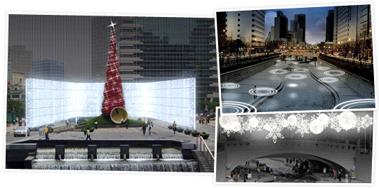 루체비스타는 생략하고 예년보다 소박하고 은은한 순백색 빛 밝혀 ‘하이서울페스티벌 2008 겨울 빛 축제’가 오는 19일(금) 점등식을 시작으로 내년 1월 18일(일)까지 31일간 청계광장, 청계천, 서울광장 등지에서 열린다. 2008 겨울 빛 축제는 ‘순백의 겨울, 순수의 서울’을 슬로건으로 은백색(White)을 기조로 하는 빛의 축제, 세계적인 경기불황으로 그 어느 해보다도 추운 겨울을 맞고 있는 시민들에게 내일의 희망을 주기 위한 ‘경제희망 밝히기’가 화두다. 이번 축제에선 빛의 혁명이라 불리는 발광다이오드(LED)를 주로 이용한 고효율ㆍ친환경 조명연출로 지난해보다 에너지 사용량을 줄였다. LED는 전압을 가하면 빛을 내는 반도체로 전기에너지의 90%가 빛으로 전환될 정도로 광(光) 효율이 높은 자연친화적 제품으로 ‘빛의 혁명’, ‘꿈의 혁명’ 등으로 불린다. 저탄소 녹색성장의 시대적 흐름에 맞게 대기환경 개선 및 이산화탄소 배출 감축효과 등의 장점이 있다. 그러나 축제의 즐거움은 배로 늘렸다. 19일 청계광장에서 열리는 점등식에는 2008 베이징올림픽에서 수영사상 첫 금메달을 획득하며 국민들에게 큰 기쁨을 주었던 박태환 선수가 참석한다. 청계천에는 ‘은백의 스크린’과 ‘순백의 연못’, ‘디지털스트림’, ‘랜드마크 건물’ 등이 설치된다. ‘디지털 가든’은 청계천 옹벽상부 화단에 설치하는 프로젝터와 기존의 청계천 옹벽을 스크린으로 활용해 진행된다. 18:00부터 20:00까지 2시간 동안 광교~장통교 구간에서 미구엘 슈발리에의 작품 ‘3차원의 디지털 꽃, 프랙탈 플라워’ 등을 연출한다. 시민들이 각자의 소망을 적은 메모지를 직접 걸어 ‘소망트리’(광통교 부근)를 완성해 나가는 이벤트도 진행되고, 빛을 소재로 하여 예술과 첨단기술이 조화를 이룬 ‘디지털스트림’(광교 상․하류)은 시민들에게 새로운 영상체험 공간을 제공한다.