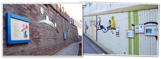 한 동네의 분위기가 바뀌고 있다. 요즈음 도시디자인이 열풍이지만 어쩌면 애매모호한 디자인 개념이 구체적으로 일상에 가까이 다가 온듯한 느낌이다. 최근 예전에 살던 금천구 독산동의 지인을 만나러 갔다가 산뜻하게 변한 아니 아직도 변신중인 동네 모습에 놀랐다. 독산3동은 관악산 줄기에 터 잡은 주택가지만 변화와 발전에 소외된 비교적 낙후된 곳이다. 그래서 가끔 찾을 때마다 과거의 고착된 이미지를 떠올리곤 한다. 하지만 동네 이미지가 일순간 변했다. 동네 곳곳에서 볼 수 있는 소소한 갤러리들이 이미지 변신의 주인공들이다. 어린이 놀이터의 흉물인 물탱크가 꽃그림이 있는 벽화가 되고, 눈길 한번 주기도 버거운 방범초소가 동심을 자극하듯 예쁘게 단장됐다. 배수지를 떠받치고 있는 커다란 옹벽은 형형색색의 타일 벽화를 그린 아름다운 담장으로 변했다. 한 빌라 옹벽은 "아름다운 물건"이라는 주제로 주민들의 소장품과 추억을 새긴 액자를 재밌게 걸어 벽화갤러리를 조성했다. 야산인 독산자연공원을 오고가는 길목은 시화전 풍경 그대로를 연출했다. 고등학교 재학생의 시화에 주민이 직접 지은 시와 사연을 액자와 플래카드에 담아 오고가는 주민들에게 마음의 양식을 전한다.