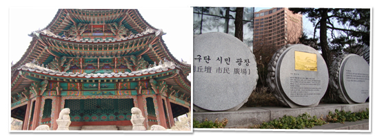 환구단 정문이 복원된다고 한다. 정확히 말해 강북구 우이동 옛 그린파크 호텔 출입문을 시청 옆 환구단 시민 광장으로 옮겨 오는 것이다. 원래 이 문은 환구단의 정문이었다. 40년 전에 우이동으로 옮겨진 것이다. 어떤 사연으로 산자락에 위치한 호텔까지 가게 되었는지는 알 수 없으나 이제야 제자리를 찾아 돌아온다니 다소나마 위안을 삼는다. 어디 환구단의 기구한 운명이 이 문에만 있겠는가? 서울역사박물관에서 보았던 1897년 대한제국 시절 환구단의 원래 모습은 현재의 모습과는 사뭇 다르다. 대부분의 유적이 사라져 그 행방을 알 수 없다. 지금 우리가 볼 수 있는 것은 황궁우와 석고뿐이다. 그나마 황궁우는 높게 솟은 도심 빌딩들에 포위되어 조각 하늘만 겨우 볼 수 있다. 고종이 황제에 올라 신하들을 거느리고 하늘에 제를 지내기 위해 지은 곳이 환구단이다. 황궁우는 태조를 고황제로 추존하고 그 위패를 모신 사당이다. 석고는 돌로 만든 북인데 새겨진 용 무늬가 몇 번을 봐도 힘이 넘쳐난다. 대한제국은 1897년부터 국권을 빼앗기는 1910년까지 13년 정도의 아주 짧은 시기이다. 그러나 이 기간에 너무나 많은 역사적 소용돌이가 몰아친다. 1905년 을사늑약으로 외교권을 강탈당하고 1910년 일제강점기가 시작되는 슬픈 역사의 파란이 모두 이 시기에 일어난다. 그런 한 많은 대한제국의 운명과 환구단은 그 길을 같이 걷는다. 고종이 황제에 오르면서 그 상징으로 거처하던 경운궁(현 덕수궁) 바로 옆에 지었던 환구단을 일제는 1913년 헐어버리고 그 자리에 철도호텔을 짓는다. 지금 우이동에서 발견된 환구단 정문처럼 당시에 목조 유적들은 해체되고 뜯겨 호텔의 출입문이나 부잣집 현관문 또는 정원의 미관을 살리는 목재로 팔려갔다. 이런 슬픈 현실은 우리 생활 속에서 쉽게 볼 수 있다. 단지 우리가 모르기 때문에 그냥 지나치는 것일 뿐이다. 경희궁의 정문이 이름만 들어도 알 수 있는 유명 모 호텔의 출입문 역할을 하다 다시 자리를 찾아 돌아온 것은 그리 오래전 일이 아니다. 경복궁의 정전 역할을 하는 곳이 근정전이라면 경희궁의 정전은 숭정전이다. 이 정전이 지금은 법당으로 쓰이고 있다면 믿을 수 있겠는가? 현재 경희궁 자리에 있는 정전은 단지 복원을 해놓은 것일 뿐이다. 일제강점기 동안 목조건축은 그렇게 누구의 보호도 받지 못한 채 일본인들과 돈 있는 자들에 의해 거래되어 팔려나갔다. 우리는 이제 좀 더 눈을 크게 뜨고 주위를 살펴보자. 이름 모를 오래된 고건축물이 맞지도 않게 현대식 건물의 출입구나 조형물로 사용되고 있지는 않는지, 그것이 잃어버린 궁궐의 서까래일 수도 있고 유적지 목조건축의 일부일 수도 있다. 모두 찾아내고 다시 원래의 자리로 옮겨오기에는 우리가 가진 자료는 너무나 빈약하다.