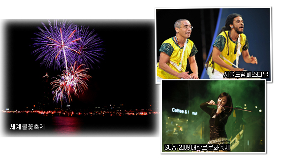무료로 시민들을 초대하는 수준 높은 축제들이 대거 포진하고 있는 9월. 가장 먼저 잔치의 서막을 여는 것은 흥겨운 드럼 소리와 함께 남녀노소 외국인 모두가 즐길 수 있는 서울드럼페스티벌 2009다. 9월 5일 경연대회를 시작으로 서울 도심과 서울숲 가족마당에서 27일까지 열린다. 9개 나라 14개 팀이 초청된 아시아송페스티벌은 18일 금요일밤 서울월드컵 경기장을 또한번 뜨겁게 달굴 예정이다. 서울의 대표축제로 자리잡은 서울세계불꽃축제도 26일 토요일, 한강 여의도 지구에서 다양한 부대행사와 함께 올해도 시민들을 찾아온다. ▶ 9월 축제 프로그램