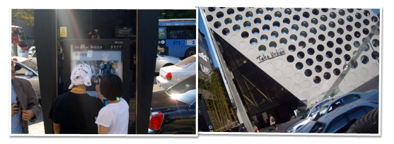 소풍 나온 어린 아이처럼 설렌 마음이었다. 지난 9일, 서울디자인투어의 오후 3시 일정에 참가하는 날, 집결지인 지하철 2호선 종합운동장 역 출구에 예정 시간보다 30~40분 일찍 도착하여 잠실 메인 스타디움 주변을 둘러보았다. 야구장 인파와 함께 서울디자인올림픽 행사장 역시 북적거렸다. 파란 가을 하늘도 멋진 디자인의 일부가 돼 주었다. 아리수와 함께 서울 디자인 투어 맵을 건네며 차량으로 인도해준 봉사자 덕분에 출발은 편했다. 첫 행선지인 강남대로를 향해 달리는 차 안에서 내다본 바깥 풍경은 주말이라 더 많이 정체된 차량행렬 때문에 디자인투어에 대한 아무런 실감도 사실 할 수 없었다. 가이드는 차 안의 분위기를 읽은 듯 "좀더 달려 우회전하여 테헤란로로 진입하면 지금까지와는 완전히 다른 거리를 볼 수 있을" 거라며, 강남역에서 교보 타워 사거리까지 약 760m 구간에 30m 간격으로 설치된 미디어폴(media pole)에 대한 설명을 미리 해주었다. 그제서야 투어 참가자들은 카메라를 꺼내며 여기저기서 셔터를 누르기 시작했다. 12m 높이의 네모난 기둥 형태로 세워진 미디어폴은 인도와 차도 양측면에 LED, LCD 화면이 설치돼 미디어아트와 광고, 뉴스를 비롯한 공공성 콘텐츠를 제공한다. 제일 꼭대기에 있는 조명으로는 가로등 효과를 내고, 제일 하단의 LCD는 터치 스크린으로 실시간 투표, 뉴스 열기 등을 생생하게 전한다.