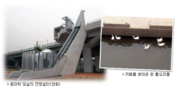 얼마 전 하이서울뉴스에 ‘한강에 내려앉은 두 마리 종이학’이란 제목으로 영등포구 소재 양화대교 전망쉼터가 소개된 적이 있었다. 가끔 자전거를 타고 양화대교 아래 한강 자전거도로를 질주하면서 무심코 공사가 진행되는 것을 보긴 하였는데 전망쉼터인 줄은 미처 몰랐다. 기사에서 본 전망쉼터의 야간 전경이 너무 아름다워 호기심이 발동했다. 직장에서 전망쉼터까지는 도보로 15분 정도 거리. 주간 전경을 시민들에게 전하고 싶어 며칠 전 점심시간 구내식당에서 점심을 얼른 먹고 양화대교 전망쉼터로 발걸음을 옮겼다. 전망쉼터의 주간 전경 역시 야간 못지 않게 아름다웠다. 카페 아리따움 ‘양화’와 ‘선유’가 대교 양쪽으로 자리한 모습은 그야말로 종이학 두 마리가 내려앉은 모습이었다. 그날따라 선유도공원 주변 한강 지킴이인 흰 물오리들이 종이학을 찾아오는 행운을 안았다.