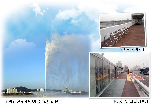 잘 갖추어진 주방에서 고객을 맞을 바쁜 손길임에도 불구하고 아름다운 미소와 상냥함으로 대하는 근무자의 모습이 보기 좋았다. 카페 내부 디자인이며 모든 시설들에서 정겨운 사랑방을 찾은 느낌이 들도록 꾸며놓은 것도 특색이었다. 주방 옆에 빼곡히 적혀 있는 메뉴판을 보니 먹을거리는 다양했고 입맛을 다시게 했다. 커피류, 주스류를 비롯해 막걸리, 와인, 칵테일까지 가격은 1,500원에서 15,000원. 모두 합하여 30여 가지가 넘었다. 오픈 시간은 성수기와 비수기로 나눠지나 봄까지는 오전 10시부터 밤 11시까지로 연중무휴라고 했다. 특히 전망쉼터 안팎으로 바닥에는 시각장애인을 위한 노란색 보도블록을 깔아 장애인들이 편리하게 이용할 수 있도록 해놓은 것이 인상적이었다. 양천구에 사는 신지수(43) 씨는 “마침 자전거를 타고 가다 들렀는데 카페 실내가 따뜻해 추위에 언 몸을 녹일 수 있고, 따끈한 커피 한 잔으로 피곤한 몸도 풀 수 있어 좋다. 무엇보다 대교 위 우뚝 솟은 전망쉼터에서 바라보는 전경이 너무 아름답다. 많은 시민들이 찾았으면 좋겠다"고 말했다. 그의 말대로 카페 두 곳 모두 푸른 한강을 마음껏 볼 수 있다. 이곳에 오면 한강이 참으로 아름답다는 것을 새삼 느낄 것이다. 버스를 타고 전망쉼터를 찾는 것도 행운이겠으나 한강변 자전거도로를 달리다가 잠시 전망쉼터를 찾아 추위를 녹이고, 확 트인 주변 경관을 둘러보며 휴식 시간을 갖는다면 가보지 못한 사람들의 질투대상이 될 것임이 틀림 없다. 전망쉼터 바로 옆과 대교 아래에는 자전거 거치대가 잘 마련되어 있고, 대교 아래로는 한강공원으로 자전거를 끌 수 있는 계단을 이용할 수도 있고, 국내에서는 보기 드문 경사형 엘리베이터를 이용해 오르내릴 수 있도록 되어 있다.