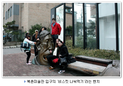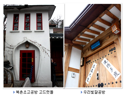 북촌미술관, 명인박물관, 원앤제이갤러리, 동림매듭박물관 첫 번째로 발길이 닿은 곳은 북촌 미술관. 공교롭게도 취재날이 바로 2월 28일이었는데, 이 곳은 그 옛날의 3.1운동 거사 전날인 2월 28일 민족대표 33인이 독립선언식의 절차를 협의하기 위해 최종 모임을 가졌던 곳으로 유명한 손병희 선생의 집터였던 곳으로 의미가 깊다. 지금은 신태수 그림전이 한창 진행 중이었다. 전시 제목은 '진경산묵'. 조선 후기 산천을 소재로 그린 산수화를 진경산수 혹은 실경산수화라고 하는데 종래의 형식화된 창작태도의 한계를 깨고 좀 더 발전된 화법이라 할 수 있다. 이러한 우리 조상들의 화풍을 이어오고 계신 신태수 화백의 그림전은 3월 12일까지 계속된다. 북촌 미술관 바로 건너편에 언뜻 보면 카페인지 박물관인지 모를 ‘명인박물관’이 자리하고 있다. 1층에서는 한쪽에 고미술품을 전시하고 판매하고 있으며 한쪽에서는 페르소나라는 카페도 운영하고 있는데 페르소나라는 이름에서도 암시하듯 사실 명인박물관은 ‘탈’ 박물관으로서 건물 지하로 내려가면 세계 각국에서 수집한 탈 500여 점을 관람할 수 있다. 명인박물관을 시작으로 가회로를 따라 쭉 걷다 보면 리모델링한 한옥이 보이는데, ‘원 앤 제이 갤러리’다. 한옥의 여러 방들을 돌며 현대 미술을 감상할 수 있는 매력이 있는 곳인데, 재미있는 것은 사랑채 앞에 있는 ‘쿵후 벤치’. 중국 영화에서 싸울 때 무기로 쓰는 의자이기 때문에 붙여진 이름이라 한다.