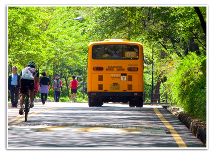 버스에서 내렸다. 남산타워에 올라가 시원하게 펼쳐진 서울 전경을 바라보자 그동안 쌓였던 스트레스가 한방에 날아가 버리는 느낌이다. ‘아차, 오늘의 목적은 남산구경이 아니지!’ 남산을 내려가는 옐로버스로는 2번 버스를 선택했다. “어서 오세요!” 활짝 웃으며 반겨주는 버스기사는 한자동 기사님이다. “외국 손님들? 간단한 의사소통은 자신 있지!” 기자가 외국 분들이 많이 타실 텐데 어려움은 없는지 물었더니 의사소통에 전혀 문제없다고 자신 있게 말한다. “안녕히 가세요!” 한자동 버스기사의 친절한 인사를 뒤로 하고 버스에서 내렸다. 옐로버스를 운영하는 북부운수 이근성 총무부장은 “남산은 가족들이 나들이 하는 곳이기도 합니다”라며 “연세도 지긋하신 버스기사가 아이들에게는 할아버지 같은 포근한 인상을 주고, 실제로 운전도 편안하게 하시기 때문에 옐로버스의 기사들은 특별히 선별된 분들입니다”라고 기사들을 칭찬했다. “이분들에게는 외국인 강사를 초빙해서 외국어 교육을 시킵니다.” 옐로버스기사들은 영어는 물론, 중국어, 일본어까지 간단한 의사소통이 가능하도록 교육받기 때문에 외국인을 만나도 문제 없다고 말한다.