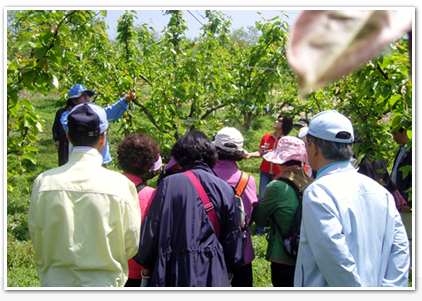 오늘도 농촌체험의 향긋한 냄새가 풍겨오는 그린투어가 시작됐다. 제일 먼저 들린 곳은 노원구 중계동에 있는 배 과수원이었다. 이곳에서 배의 생산에서부터 수확할 때까지의 전 과정에 대한 설명과 체험의 시간을 가졌다. 시민기자도 꽃가루 수정실습을 해보았는데 옛날에는 손으로 문질러 발랐는데 요사이는 분사기형태(Love Touch)의 기기를 사용하고 있었다. 이곳에서 농장주로부터 또 한 가지 중요한 사실을 알았다. 그것은 추석 전 나오는 배는 주로 황금배인데 저장성이 없어 아까워 할 것 없이 바로 먹어야 상하지 않는데 반해, 추석 이후에 출하되는 신고배는 보관이 용이하여 선물용으로 적합하다고 한다. 이어서 우리들이 길조로 여겨온 까치가 다 익은 배를 쪼아서 상품이 될 수 없게 하여 부득이 이 횡포를 막기 위한 시설을 할 수밖에 없다는 얘기도 들었다. 이 시설은 텃새인 까치가 자기 영역에 다른 까치가 오면 집중공격을 하는 습성이 있다는 사실을 이용해 덫(까치 트랙) 속에 다른 지역 까치를 넣어놓는 것이다. 그러면 텃새의 습성대로 까치들이 들어갔다가 나오지 못해 훌륭한 배 상품을 얻을 수가 있다고 했다.