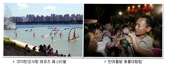 도심 속 자연 체험! '2010 한강사랑 레포츠 페스티벌', '한여름밤 동물대탐험' 등 아이들과 가족이 함께 도심 속에서 자연을 접하고 체험해 볼 수 있는 프로그램도 풍성하다. 8.7(토)~8(일) 양일간 뚝섬 한강공원수변무대에서 열리는 ‘2010한강사랑 레포츠 페스티벌’ 은 각종 수상체험과 어린이레포츠를 체험해 볼 수 있는 신나는 시간이 될 것이다. 어린이들의 자연체험장인 서울대공원에서도 여름방학을 맞아 동물과 친해지는 프로그램을 준비했다. '사육사와 함께하는 camping at the zoo(7.25~8.23)', '2010동물대탐험(7.28~8.20)’, ‘한여름밤 동물대탐험(7.23~8.21)’, ‘곤충과 친구하기(7.23~8.20)’, ‘여름식물생태체험(7.19~8.27)’ 등이 준비되어 있고, 그 외에도 ‘아프리카축제(~8.31)', ‘햇빛 숲속여행(~11월)’, ‘달빛 숲속여행(~11월)’, ‘피톤치드 숲속여행(~11월)’ 등의 프로그램이 활발하게 진행될 예정이다. 대한민국 전통을 직접 경험! '올망졸망 박물관 놀이교실', '한풍체험마실' 등 TV도, 컴퓨터도 없던 우리 선조들은 어떻게 살았을까? 서울역사박물관의 ‘전통매듭체험교실(7.6)’, ‘올망졸망 박물관 놀이교실(7.7~8.6)등은 놀이를 통해 선조들의 삶을 경험할 수 있는 전통 체험 프로그램이다. 남산골한옥마을에서 매일 열리는 ‘한풍체험마실’은 2천원~8천원의 저렴한 가격으로 한지공예, 손글씨, 국악기체험, 다도 등을 배워볼 수 있는 프로그램이다. 매주 토요일 혹은 일요일에는 ‘전통문화체험’ 으로 미니솟대, 장승, 제기 등을 만들어 볼 수 있으며 전통혼례 시연도 있다. 이외에도 ‘우리종가 이야기’, ‘문화예술 한마당’, ‘예절교육’등이 상시 열린다. 전통의상을 입고 사진촬영을 해 보거나 전통문화예절 등을 체험할 수 있는 운현궁의 체험프로그램도 이용할 수 있다. 하루코스로 즐기는 색다른 문화관광! '서울문화예술탐방', '홍대앞 재발견' 서울에 각종 문화코스를 하루 동안 즐길 수 있는 프로그램도 인기다. 먼저, 올해로 4년째를 맞고 있는 '서울문화예술탐방(7.8~24 지정일자)'은 내가 살고 있는 서울 구석구석에 숨겨진 문화 공간인 미술관ㆍ박물관ㆍ건축&디자인탐방 등을 경험할 수 있다. 아이들을 학교에 보내고 알차고 여유 있는 시간을 보내고픈 주부, 문화에 관심 있는 대학생과 어르신들의 참여도가 높다. 서교예술실험센터에서 진행하는 홍대앞 문화예술 탐방프로그램인 ‘홍대앞 재발견(7.25)’도 하루 코스로 즐길 수 있다. 심장박동소리처럼 젊음과 문화가 역동적으로 움직이는 홍대앞에서 흥겨운 시간과 새로운 재미를 찾는 즐거움으로 큰 사랑을 받고 있다. 그 외에도 단돈 천원으로 즐기는 세종문화회관의 ‘천원의 행복(7.26~27)’이 변함없이 찾아가며, 서울시향의 '찾아가는 음악회, 실내악의 아름다움(7.16)'이 서울역사박물관에서 펼쳐진다. 또한, 열린극장 창동의 ‘스타킹버블맨의 버블파티(7.17~25)’,‘금난새와 함께하는 브런치콘서트(7.27)’등도 마련되어 있다. 다양하게 마련된 7월의 무료 및 저렴한 문화프로그램 안내 및 행사문의는 서울컬처노믹스 블로그(http://culturenomicsblog.seoul.go.kr) 및 120 다산콜센터로 하면 된다. 문의: 다산콜센터 ☎ 02)120 하이서울뉴스/박혜숙 |