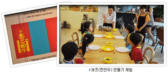 하지만 우리와 전혀 다른 풍습들도 있어 흥미를 끈다. 몽골인들은 특유의 대음력을 사용하여 한 해를 표시한다. 1월 1일은 차강사르(하얀 달)라 부른다. 이들은 이른 새벽부터 늦은 밤까지 동물과 같이 하루를 보내기 때문에 민속놀이 중에는 동물이 차지하는 비중이 높다고 할 수 있다. 또한 유목생활을 하는 몽골인들에게는 손님이 방문하는 일이 드물기 때문에 손님 접대가 극진하다. 그리고 몽골인들은 다른 사람을 향해 손가락이나 말채찍으로 절대 가리키지 않는다. 이는 상대를 불쾌하게 만드는 행위라고 보기 때문이다. 몽골 문화촌에는 몽골의 역사를 시대별·연대별로 비교해 볼 수 있는 역사관이 있고, 몽골의 풍부한 지하자원과 야생식물, 동물, 곤충을 전시한 생태관 그리고 사냥도구, 복숭아뼈로 만든 놀이인 샤가이, 몽골의 체스인 사타르, 퍼즐, 전통악기를 연주할 수 있는 어린이 체험관이 있다. 이밖에도 몽골의 전통음식인 보쯔(찐만두), 호쇼르(군만두), 허르허그(뜨겁게 달군 돌을 이용하여 만든 요리), 수테차(우유차) 등도 직접 만들어보는 체험 프로그램도 있다. 지구촌 체험관장 이은숙 씨는 "몽골은 아시아 원조 중점 협력국가이며, 올해는 우리나라와 수교 20주년을 맞는 해다. 역사적, 지리적으로 우리와 가까운 나라이고, 자긍심이 강한 국민성과 음식문화나 손님을 극진히 대접하는 관습도 우리와 같은 점이 많다. 이번 전시는 3개월을 운영하면서 관람객들이 무엇을 느끼고 가며 어떤 도움이 될 것인가에 초점을 맞췄다. 현재 한국에는 몽골인이 3만여 명이 체류하고 있으며 광진구에는 몽골인 학교도 운영 중이다"라고 말했다. 현재 체험관에는 하루 150여명의 관람객이 방문하고 있는데, 초등학생들이 주를 이루며 부모님과 함께 한다.