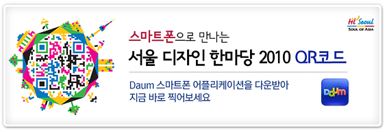 QR 코드로 만나는 '디자인한마당2010'…행사 연상 효과도 만점 ‘서울디자인한마당 2010’ 개막이 보름 앞으로 다가왔다. 9월 17일 개막하는 ‘서울디자인한마당 2010’은 10월 7일까지 잠실종합운동장을 비롯해 마포·홍대, 구로, 동대문, 강남 신사동 등 서울 곳곳에서 펼쳐진다. 4대 디자인 클러스터별로 특색 있는 프로그램이 다채롭게 진행되는데, 어디서 무엇부터 관람하고 참여해야 할지 어려움을 느낀다면, 최근 서울시가 새롭게 내놓은 '디자인 QR(Quick Response) 코드'를 활용해보자. 최근 스마트폰의 보급이 확대되면서 새로운 마케팅 수단으로 인기를 끌고 있는 QR 코드의 변신을 체감할 수 있다. 흑백 격자무늬 패턴으로 정보를 나타내는 2차원 바코드인 QR 코드에 디자인적인 요소를 가미하여 독창적으로 제작된 ‘서울디자인한마당 QR 코드’는 디자인한마당의 행사 정보는 물론 사진, 동영상, 이벤트, 트위터 서비스 등을 다양하게 제공한다. 20여 개 프로그램에 대한 정보가 담겨 있을 뿐만 아니라, 전시되는 작품들에 대한 상세한 설명도 볼 수 있어 개인 도슨트로도 활용이 가능하다. 특히, '서울디자인한마당 2010'의 심볼 마크인 조각보 모티브를 활용하고, 청색·적색·녹색·황색·검정색을 주색으로 사용함으로써 한눈에 '디자인한마당2010'을 연상케 하는 효과도 톡톡히 누리고 있다.
