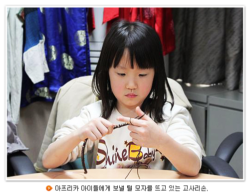 지난 주말 지구촌체험관을 다시 찾은 건 아프리카 신생아를 살리기 위한 털 모자 뜨기 캠페인에 참석하기 위함이었다. 국제아동권리기관인 세이브 더 칠드런(Save the Children)과 공동으로 진행하는 교육프로그램이었다. 오전 시간에는 초등학생을 위주로, 오후 시간에는 중학생 이상을 위주로 진행되었다. 처음 뜨게 바늘을 잡은 아이들도 진지한 표정으로 선생님의 지도에 따랐다. 고사리손으로 한땀 한땀 뜬 털 모자는 아프리가 아이들의 생명을 지키는 소중한 선물이 될 것이다.