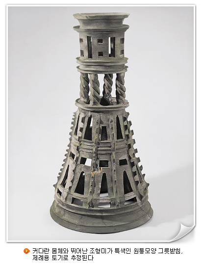 둥근바닥 항아리를 받치는 기능의 토기를 그릇받침이라 하는데 고대 토기 중에서도 그 모양과 쓰임새가 유달리 독특한 유물이다. 납작바닥 토기가 널리 쓰인 고구려를 제외한 신라, 백제, 가야 등지에서 주로 발견된다고 한다. 크게 화로모양, 바리모양, 원통모양으로 구분되는 그릇받침. 이번 기획전의 첫 테마는 원통모양이다. 화로모양과 바리모양 그릇받침이 일반용기와 받침으로서의 기능이 복합된 것인데 반해 원통모양 그릇받침은 처음부터 받침의 용도가 강화된 것이었다.