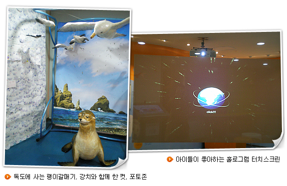 체험관에서 만난 김주영(7), 도영(3) 형제는 틈만 나면 놀러온단다. 도영이는 홀로그램 터치스크린을 좋아한다. 주영이는 여기저기 돌아다니며 터치패널을 눌러 메뉴를 감상한다. 여기서 놀면서 달라진 게 있느냐고 아이들 엄마에게 물으니 “독도 얘기가 뉴스에 나오면 관심 있게 본다”고 한다.