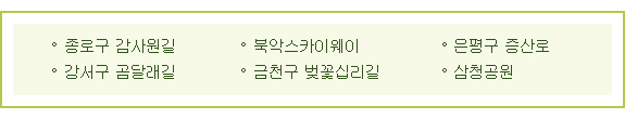 서대문구와 은평구의 불광천변, 구로구, 영등포구, 금천구, 영등포구를 잇는 안양천변, 서초구와 강남구의 양재천변 그리고 남산공원 순환로와 청계천도 빼놓을 수 없는 봄꽃길이다.