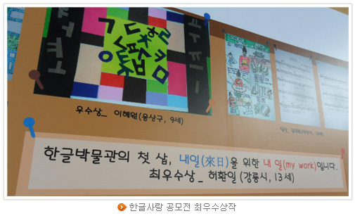 행사장에는 그 동안 전국 초·중·고등학생을 대상으로 실시된 ‘한글 사랑 공모전’ 출품작도 전시돼 있어서 눈길을 끌었다. 행사를 마치고 학생들 작품을 하나하나 눈여겨보고 있는 김윤지(일산 풍산초등2) 학생은 인터넷신청으로 뽑혀서 왔다며 “세종대왕께서 만들어주신 한글이 자랑스럽고 행사에 참석할 수 있어서 뜻 깊다”고 어른스런 소감을 전했다. 서울 석관중학교 여학생들도 "우리 역사를 다시 생각해 봤어요", "한글을 더 사랑할 수 있을 것 같아요", "한글을 함부로 쓰지 않고 소중하게 여길 거예요", "세종대왕 파이팅"이라고 전했다.