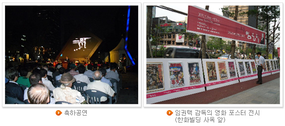 낮에는 더웠지만 밤에는 가을 냄새가 풍기는 초가을 밤. 시민들은 모두가 청계천 한빛광장에서 음악에 흠뻑 빠져 있다. 음악과 함께 임 감독의 첫 작품부터 101번째 작품까지 아우르는 미디어 영상이 펼쳐졌다. 거장 임권택 감독은 항상 이렇게 말했다고 한다. “예술에 완성이 어디 있어. 온몸으로 몸부림치고 또 쳐도 얻을까 말까한 게 그놈의 예술이거든...” 2시간여 동안 시민들은 임권택 감독의 작품세계에 푹 빠졌다. ‘영화감독 50년, 101영화전’ 전시회는 9월 7일까지 이어진다. 예문갤러리, 한화사옥1층, 한빛미디어 광장에서 영화자료 수집가인 정종화 씨가 모은 각종 사진, 인터뷰 자료, 포스터와 영상을 볼 수 있다.