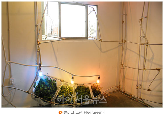가장 오른쪽에 전시되어 있는 작품은 초록빛 채소가 있는 도심텃밭이다. 을지로 재개발 제5지구는 20년 째 재개발이 미뤄지고 있다고 한다. 그로 인해 노후화되고 열악한 환경에서 사람들은 계속 일하고 있다. 건축가 박하늬 씨의 '플러그 그린(Plug Green)! 프로젝트'는 이러한 문제의식을 기반으로 현재부터 재개발 직전까지를 프로젝트의 기간으로 정하고 있다. 비어있는 공간을 단기 도심텃밭으로 이용하여 노후한 환경을 개선하고 더 나아가 시민들과 열린 커뮤니티로 거듭나길 기대하고 있다.