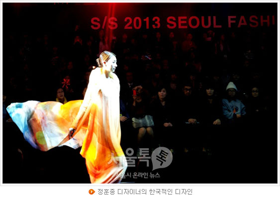 지난 25일 '2013 S/S 서울패션위크' 네 번째 날 이목을 끈 두 가지 컬렉션을 소개한다. 디자이너 정훈종과 안윤정의 작품은 가장 한국적이면서도 가장 세계적인 미를 강조했다는 점에서 다른 컬렉션들과 차별을 이뤘다. 한국적인 요소를 컬렉션 곳곳에 배치한 두 디자이너들의 쇼는 국내 관람객을 포함해 해외 바이어와 언론들의 눈을 사로잡기에 충분했다.