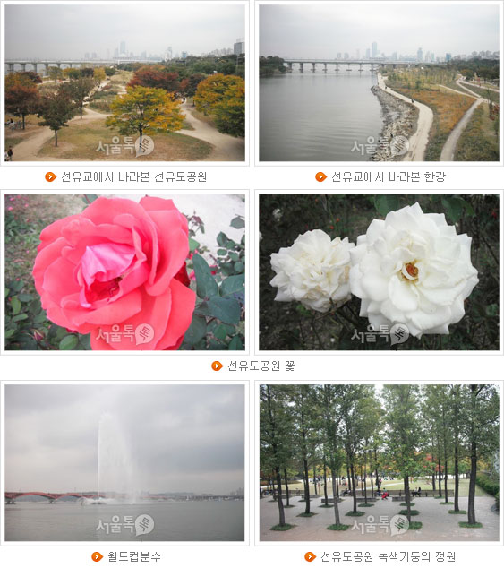 공원 안 쪽에는 초록빛에서 노란빛으로 몸을 바꾸며 가을의 정점을 향해 달려가는 은행나무가 자리하고 있고, 가을하늘 높은 줄 모르고 솟아오르는 분수는 하늘을 수놓는다. 선유도 둘레를 따라가는 산책로에는 붉은 옷을 입은 단풍나무가 있고, 녹색기둥의 정원에는 이미 지난 봄에 꽃을 피운 자작나무가 줄을 맞춰 가을이 빨리 오라 손짓한다. 단풍이 지기 전, 도심 속에 자리한 선유도 공원으로 나들이 가는 것은 어떨까? 나무 사이사이로 불어오는 강바람을 맞는 것이 생각보다 훨씬 상쾌하다.