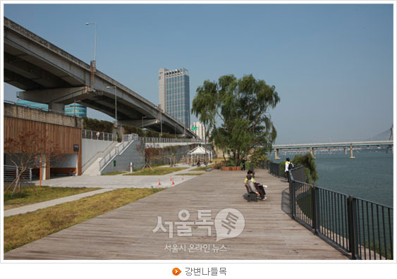 이 일대는 자연형호안으로 조성되어 있어 물가에 맞닿아 낚시를 즐기는 사람, 호안자갈로 장난치는 아이들 등 옛 강변 풍경을 만날 수 있다.