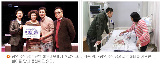 뮤지컬 이야기쇼 '이석준과 함께'는 뮤지컬 배우와 관객이 소통하는 공연이다. 함께 일하는 스텝은 소정의 수고료만 받고 일한다. 어떤 스텝은 오히려 자신의 비용을 투자하면서 공연을 이끌고 있다. 이석준 씨 역시 '노 개런티'다. 공연 수익금은 전액 불우한 이웃에게 전달된다. 유료로 공연을 봐주시는 분들이 더 늘어나야 하는 이유다. 매회 공연 말미에는 관객에게 공연 수익금을 전달하는 동영상을 보여준다. 불치병에 걸린 아이가 환하게 웃는 모습이 화면에 나타나면 이내 공연장은 숙연해진다.