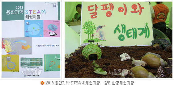[서울톡톡] 서울과학전시관에서 '2013 융합과학 STEAM 체험마당'이 열렸다. 이는 21세기 '개방, 소통, 창의, 융합'의 시대에 맞아 창의적인 사고를 지닌 융합인재 육성을 위해 마련된 행사이다. 'STEAM'이란 과학의 'Science', 기술의 'Technology', 공학의 'Engineering', 예술의 'Arts' 그리고 수학의 'Mathematics'의 각 첫 글자를 이용하여 만든 용어로 미국의 STEM(Science, Technology, Engineering, Mathematics) 교육과정에 Arts(예술)가 통합된 과정을 의미한다.