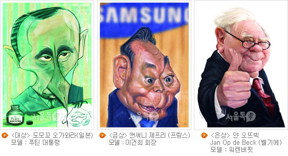 공모전 대상에는 도모꼬 오가와라 (일본, 모델 :푸틴 대통령, 미화5000 달러), 금상에는 앤써니 제프리 (프랑스, 모델 : 이건희 회장, 3000 달러), 은상에는 얀 오뜨빅 (벨기에, 모델 : 워렌버핏, 2000 달러)등이 선정 됐으며, 수상자에게는 상금 및 상패와 부상이 주어진다. 또한 전시기간 중 관객이 뽑은 '베스트10' 작품을 선정해 특별상을 수여한다.