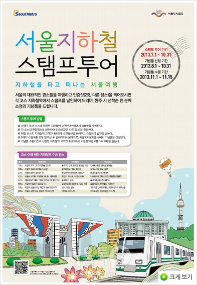 [서울톡톡]지하철 타고 서울 구경하면서 인증샷 찍고 기념품도 받자! 서울메트로(1~4호선 운영)와 서울도시철도공사(5~8호선 운영)는 7월 1일(월)부터 10월 31일(목)까지 지하철을 타고 서울명소를 둘러보는 '서울지하철 스탬프투어'를 펼친다고 밝혔다.
