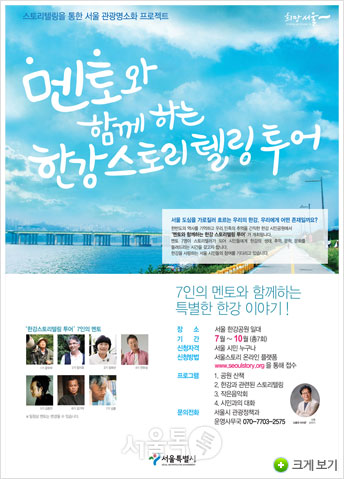 '멘토와 함께하는 한강 스토리텔링 투어'는 오는 10월까지 전 국립과학수사연구원 원장 정희선(8.28 수), 희극인 전유성(9.7 토), 사진작가 김중만(9.28 토), 영화감독 김기덕(10월), 소설가 김훈(10월) 등 많은 멘토들과 함께 다양한 주제로 한강의 주요공원에서 진행될 예정이다.