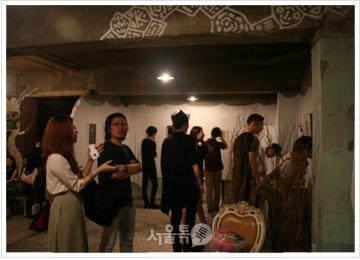 철공소가 모인 골목을 지나 부서진 '신정다방' 세로간판 바로 아래, 'atelier flaneur'라는 간판이 붙여진 건물을 만나게 된다. 이 건물 아래 계단으로 내려가면, 스산한 기운의 아지트를 연상케 하는 지하 공간이 있다. 들어서니 안은 사람들로 꽉 차 있고, 박수 소리가 가득하다. 20일 오후 7시 이 공간에선 '펜화 일러스트 그룹전' 오픈식이 열렸다. 공간을 차지한 사람들 중 마이크를 들고 자신을 소개하는 사람들은 바로 이 그룹전에 참여한 작가들이었다.