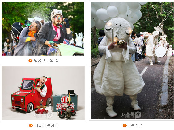 또한 건물의 외벽을 무대삼아 춤추는 버티컬 댄스와 불꽃 퍼포먼스 '신기루', 이동형 공연인 '바퀴 (무지막지 서커스)', '길 떠나는 난쟁이' 등이 선유도공원 곳곳에서 펼쳐져 관람객들에게 즐거움을 선사한다.