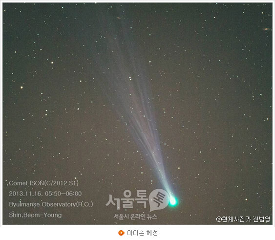 푸른 빛의 긴 꼬리를 가지고 있어 꼬리 치는 혜성이라는 별칭으로도 불리는 아이손(ISON.C/2012 S1)혜성은 지난해 9월 러시아 천문학자들이 주도하는 아이손(ISON·International Scientific Optical Network)이라는 국제천문연구단체가 발견했다. 현재 많은 천문애호가들은 아이손 혜성의 멋진 모습을 기대하며 관심 있게 지켜보고 있다.