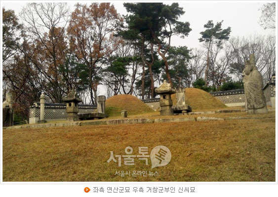나무 바로 위쪽에는 폭군으로 알려진 조선왕조 제10대 임금 연산군(1475~1506) 묘가 있다. 연산군은 성종의 아들로 태어나 19세 때 임금이 되었다. 시를 잘 짓는 똑똑한 왕이었지만, 12년에 불과한 짧은 재위 기간 동안 두 차례나 피바람을 일으키며 폐위됐다. 강화도로 추방된 연산군은 31세로 일생을 마치고 그곳에 묻혔다가 7년 후인 1531년, 연산군의 왕비인 거창군부인 신씨(1472~1537)의 요청으로 이곳 방학동으로 옮기게 된다. 1537년, 신씨도 그의 곁에서 잠들었다.