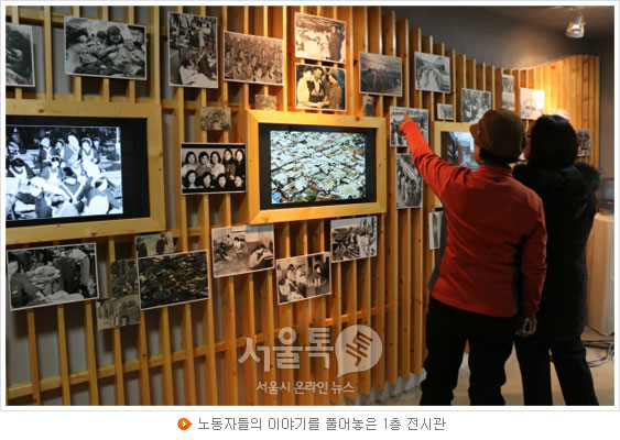 1층에는 노동자들의 이야기를 풀어놓은 전시관이 위치해 있다. 12시간의 고된 노동 속에서도 배움의 끈을 놓치 않기 위해 야학에 다니고, 복습을 하는 '순이'라는 이름의 소녀의 일상을 조각상으로 만들어 놓았고, 함께 사진을 찍을 수 있는 포토존도 설치되어 있다.