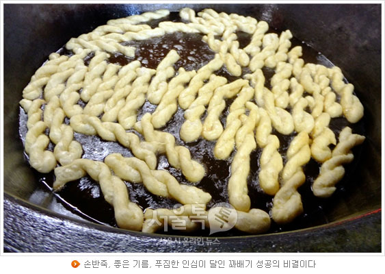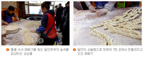 조그맣게 떼어낸 반죽들이 공중에서 한번 휙 돌더니 순식간에 꽈배기 모양으로 만들어진다. 달인이 왼손을 이용해 반죽을 공중으로 던지면 회전하면서 바닥에 떨어지자마자 어느새 잘 꼬인 꽈배기 모양이다. 모든 꽈배기들이 같은 크기로 정확히 일곱 번 꼬인단다. 그 신기한 손놀림에 꽈배기를 사러 왔던 손님들이 줄을 서서 흥미롭게 구경하고 있다. 꼬불꼬불 꽈배기 모양을 내는 것은 꽈배기를 부풀어 오르게 해 더 크게 보이도록 하는 효과도 있고, 맛의 변질을 막는 등 시각적이면서 과학적인 이유가 있다하니 재미있다.