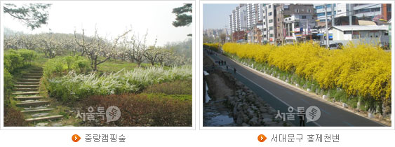 한강은 서울의 젖줄이기도 하지만 봄이 오는 통로이다. 잘 조성된 자전거길과 산책로는 더 말할 나위가 없지만 곳곳에 피어나는 유채나 뚝섬과 여의도센터에 새롭게 심어진 야생화를 보는 재미도 크다. 성동구, 광진구, 중랑구, 동대문구를 연결하는 중랑천은 각 자치구별로 모두 손에 꼽는 봄꽃길이다. 제방 위로는 벚꽃이 만개하고 아래 산책로에는 유채, 장미, 창포 등 다양한 꽃이 화려하게 피어날 예정이다.