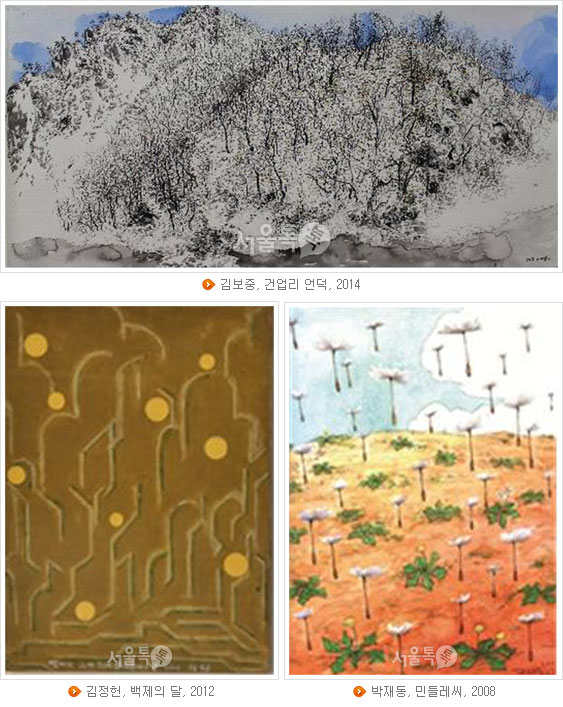 주요 작품으로는 서양화가 김정헌의 '백제의 달', 만화가 박재동의 '민들레씨' 등이 있다. 또 박능생(2004동아미술제 수상), 권인경(25회 중앙미술대전 특선) 등 중견작가와 국립현대미술관 '2014 올해의 작가상' 후보인 김신일, 그룹 '하우스룰즈'의 뮤직비디오를 제작한 일러스트레이터 김용오 등 지명도 있는 젊은 작가의 작품도 만날 수 있다.