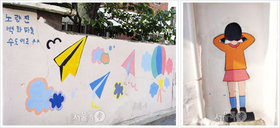 그런데 그런 이곳의 풍경이 달라져 있었다. 구석지고 낡은 골목길에 쭉 들어서 있던 낡은 건물들의 외벽에 새로운 변화가 일어난 것이다. 도대체 누구의 발상이었을까? 건물 곳곳마다 벽화가 그려져 있었다. 그 변화가 너무나 놀랍고 신기해 카메라에 그 풍경을 담아보지 않을 수 없었다. 벽화로 유명한 이화동 마을 한 켠을 이곳에 잠시 옮겨놨다는 느낌이랄까, 아니면 홍제동 개미마을 일부가 이사 온 기분이랄까.