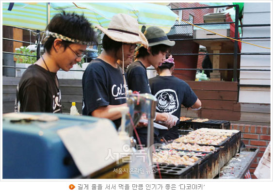그 안쪽으론 먹자골목이 이어진다. 주민들이 손수 구워온 빵이며 머핀, 쿠키나 시원한 열무국수와 같은 건강하고 안전한 먹거리를 맛볼 수 있었다. 또한, 직접 생산한 농산물을 판매하는 직거래 부스도 있었다. 특히, 일본 청년들이 만들어 판매하고 있는 다코야키가 인기였다.