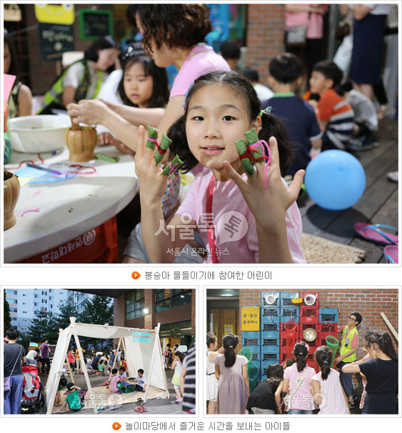 달시장엔 즐거운 아이들의 놀이 소리가 끊이질 않는다. 한 편에 마련된 마을놀이마당은 그야말로 아이들의 자유로운 놀이동산이 되어주었다. 자연재료나 재활용 재료 등을 활용한 손작업 워크숍도 흥미로웠고, 오목, 공던지기, 물레체험, 흙놀이, 봉숭아 물들이기 등의 창의 놀이 활동도 즐거웠다. 아이들도 지켜보는 부모님들도 모두가 즐거운 표정이다.
