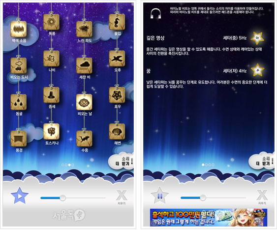 [서울톡톡] 잠이 보약이라는 옛말은 그른 것이 하나 없다. 값비싼 보양식을 끼니마다 먹고, 필수 영양소라 불리는 온갖 종류의 영양제를 복용한다고 해도 달디달게 자는 잠에 당해낼 재간이 없다. 그만큼 현대인의 건강과 뗄레야 뗄 수 없는 것이 바로 수면이다. 하지만 정작 턱없이 부족한 수면시간에, 피로와 스트레스가 누적된 우리의 몸은 깊은 숙면에 이르지도 못하고, 자고 나서도 찌뿌둥하기는 매한가지. 심지어 의외로 많은 사람들이 불면증에 시달리고 있다고 한다. 게다가, 아 이 죽일 놈의 여름! 올해도 어김없이 고온다습의 열대야 현상이 이어지니 까만 밤을 하얗게 지새울 일만 남았다? 아니다. 여기 잠 못 이루는 당신의 여름밤을 위한 숙면용 앱으로 달콤한 꿈나라로 떠나보자. |