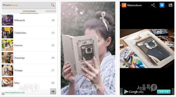 수시로 셀프사진을 찍는 사람, 또는 친구들과 모여앉아 사진찍기에 열광하는 사람에게 추천하고픈 앱이다. 포토퍼니아로 말씀드리자면 수없이 찍어댄 인물사진을 십분 활용할 수 있는 앱으로, 사진합성의 최고봉이라 할 수 있다. 잘 나온 인물사진인데, 배경이 영 꽝이라서 묵혀뒀다면 더더욱 강추. 먼저 앱을 다운받아 열면 다양한 카테고리의 사진들이 무궁무진하다. 마음에 드는 사진을 하나 열어보라. 그리고 그 사진에 스마트폰 속 갤러리 사진을 불러오거나 직접 찍으면, 한 장의 사진으로 합성이 된다. 이런 유사 앱이 많지만, 이 앱의 장점은 원본 사진의 퀄리티(해상도)가 엄청 좋아 합성 후 컴퓨터 바탕화면으로 써도 될 정도다. 게다가 씽크로율이 뛰어나 합성한 티가 전혀 나지 않고, 100% 리얼한 느낌이 난다. 일단 이 앱을 한 번 열고 나면 그 재미에 한 두 시간은 금새 지나간다. 이제 포토퍼니아로 내 사진을 펀펀(funfun)하게 만들자.