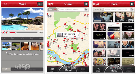 멀티미디어 세상인 요즘은 하루 사진 한 장은 기본이다. 셀카든 그냥 풍경이든 점심으로 먹은 음식이든. 이렇게 찍은 사진은 어디에서 촬영한 사진인지 데이터값이 온전히 기록되니 스스로의 고향을 갖게 되는 셈이다. 이런 사진을 모아 터치 몇 번으로 훌륭한 동영상을 만들어주는 앱이 있으니 '기아모션'이 바로 그것이다. 기아모션의 특징은 내가 촬영한 사진을 모아 동영상을 만들어 공유하면, 그 해당위치에 동영상이 자동으로 꽂힌다는 점이다. 위치기반 서비스를 십분 활용한 것. 편집도 간편하고 음악도 자유자재로 넣을 수 있으니 스마트폰 속의 이산가족사진에게 고향을 찾아주는 것도 즐거울 듯하다. 지도 위에 좌악~ 펼쳐진 나만의 기록, 이 미니 다큐멘타리 놀이에 동참해보자. 이 앱, 지~인짜 쉽고 재밌다. ^^