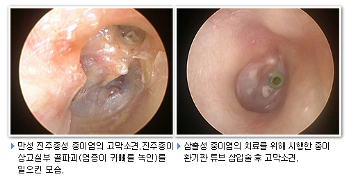 만성 중이염 여러 원인으로 인해 고막에 구멍이 나고 만성적으로 남아있는 경우로, 고막에 구멍이 있는 천공성(비진주종성) 만성 중이염과 고막의 구멍과 관계없이 진주종(피부의 각질성분이 귓속에서 자라는 염증질환) 형성이 나타나는 진주종성 만성 중이염으로 나뉜다. 일반적인 만성 중이염은 천공성(비진주종성) 만성 중이염을 의미하며 치료는 항생제 치료 또는 가능한 경우 수술적 치료로 염증제거 및 고막을 재생시키고 청력을 회복시킬 수 있다. 진주종성 중이염 귓속(중이강)이나 귀 뼈(측두골) 중 뒤쪽의 유양동 부위에 피부 각질성분인 각질화편평상피가 존재할 때 진주종이라고 정의된다. 진주종은 선천성과 후천성으로 분류되는데 두 질환 모두 각질세포의 덩어리가 점차 커지면서 주변 뼈를 녹이고 심한 경우 안면신경마비, 난청, 심한 어지럼증, 뇌막염 등의 심각한 합병증을 초래할 수 있다. 치료는 반드시 수술을 해서 염증조직을 제거하고 항생제 치료 등을 시행해야 한다. 유착성 중이염 정상적으로 고막의 안쪽에는 공기로 채워져 있는 빈 공간인데 공기의 출입이 잘 되지 않을 경우 압력이 떨어지고 이로 인해 고막이 중이 안쪽 벽에 붙는(유착) 현상이 발생한다. 이 경우, 고막의 진동이 제한을 받아 청력이 떨어지며 진주종성 중이염으로 진행될 수 있다. 최근 염증성 질환의 감소로 만성 중이염의 빈도는 감소하나 삼출성 중이염 환자 중 일부가 유착성 중이염으로 이행되는 경우가 많아 이 형태의 중이염은 증가하는 경향이 있다. 글 ∥김영호(서울특별시보라매병원 이비인후과 서울의대 교수) |