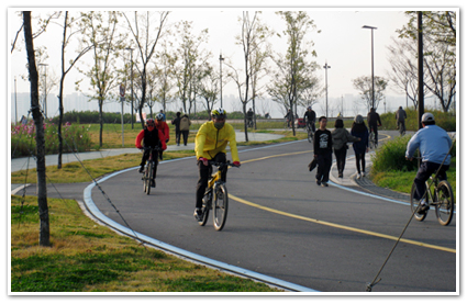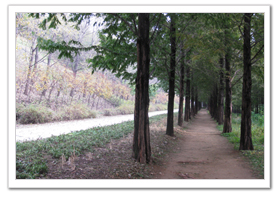 막 메타세콰이어 가로수길로 접어들려는데 공원관리자 된다는 한 분이 기자에게 다가온다. 이곳에서 멋진 사진을 찍으려면 이렇게 해야 된다며 친절하게도 방법과 위치를 알려주고 자신의 휴대전화에 담긴 작품사진도 보여주었다. 고마운 분과의 짤막한 길거리 담소를 나누고 본격적인 오늘의 자전거여행 길을 나선다. 시작부터 반가운 분을 만나서 그런지 멋드러진 가을풍경이 내 가슴 속에도 밀려들어온 듯 페달을 밟는 몸놀림이 가벼워진다. 가을비가 내린 뒤의 방문이라 전날보다 기온이 6, 7도 정도 떨어져 다소 한산할 것으로 생각했지만 예상은 완벽하게 빗나갔다. 무리를 지어 남녀가 줄줄이 쏜살같이 내달리는 전문 바이크족들뿐만 아니라 가족 단위의 자전거 여행객, 그리고 친구들과 둘셋씩 자전거를 타고 맑은 가을하늘 공기를 가르는 자전거 이용자들을 많이 만날 수 있었다. 예전 같으면 걷거나 뛰는 보행자들과 인라인을 타는 사람들, 그리고 자전거를 타는 사람들이 아슬아슬 복잡하게 뒤엉켜 생각조차 힘들었던 풍경이다.