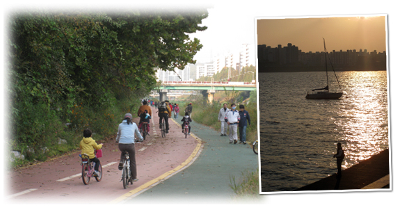 다리를 내려가서 좌측으로 가면 홍제천과 불광천 지류로 연결되는 자전거 도로가 시원스럽게 연결되어 있고, 좌측으로 좀 더 가면 망원한강공원으로 향하게 된다. 강을 거슬러 올라 양화대교를 건너면 폐정수장을 재활용해 만든 선유도공원의 멋진 풍경도 감상할 수 있다. 이곳저곳 둘러보는 사이 어느덧 해가 저물고 있었다. 난지한강공원변에 드리워진 붉은 석양을 배경으로 수상레저(윈드서핑, 수상스키 등)를 즐기는 사람들과 강물에 낚시대를 기울이고 있는 강태공들도 만날 수 있었다. 그 외에도 난지한강변에는 잔디야구장 두 곳과 난지캠핑장, 자전거ㆍ인라인 X-게임장 등이 조성되어 있어 즐길 거리가 풍성해 보였다. 상암과 난지 한강공원 일대를 돌아보니 확실히 예전과 달리 한강공원을 찾는 이용자의 안전과 편의 증진을 위해 기울인 노력의 흔적을 곳곳에서 확인할 수 있었다. 자, 이제 여러분도 가족들 또는 친구들과 함께 한강공원으로 자전거여행을 떠나보실까요? 시민기자/박태진 |