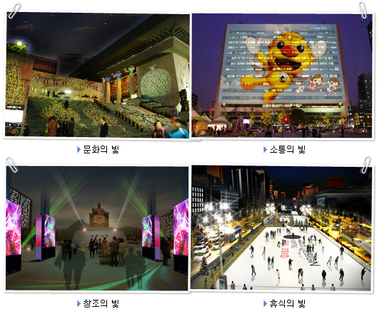 2009 서울빛축제 : 광화문광장이 거대 멀티플렉스 영화관으로 세계적 미디어아트 축제로 구성되는 「2009 서울빛축제」는 19일(토) 개막식을 시작으로 새해 1월24일(일)까지 매일 밤 광화문광장 일대가 마치 거대한 멀티플렉스(Multiplex) 영화관처럼 변모한다. 스크린은 인근의 세종문화회관과 KT빌딩 두 건물로 약 100M의 세종문화회관 전면(전면 기둥, 처마, 계단 등)과 가로 80m, 세로 60m(약 4,000인치) 국내 최대 규모(단일화면 기준)의 KT빌딩 전면이 빛의 영상을 담은 세계적인 미디어 파사드를 선보인다. 대형건물에 실시간 투사되는 미디어아트는 영웅전, 서울의 빛, 한국영화로 본 서울, 크리스마스 스토리, 미국 스트리밍 뮤지엄의 세계의 도시를 주제로 한 10여개 프로그램, 20여 편의 미디어아트다. 연출은 연세대 김형수 교수가 맡았으며 음악은 영화 <태백산맥>, <서편제> 등의 음악을 맡은 바 있는 한국 대중음악의 거성인 김수철이 직접 작사, 작곡해 매일 밤 시민들에게 선보이게 된다.
