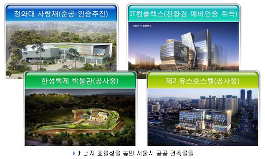 서울시 신청사… 에너지효율 1등급으로 높인다 이와 함께 공공건축물도 에너지 효율화를 위해 노력하고 있다. 서울시는 지난 4일, 앞으로 신축되는 공공건축물을 에너지 효율이 높은 건물로 만들겠다고 밝혔다. 이를 위해 시가 신축하는 모든 공공건축물은 에너지사용량을 기존보다 40% 이상 줄일 수 있도록 설계된다. 이러한 기준은 미술관, 병원, 박물관, 아동시설 등 모든 공공건축물에 해당된다. 그중 서울시 신청사는 ㎡당 연간 에너지 사용량을 300kWh 미만으로 설정하여 설계, 시공, 준공, 사용 등의 단계별로 철저히 확인할 계획이다. 에너지 사용량 300kWh/㎡·년은 현재 사용 중인 일반건축물의 에너지 사용량 400~600kWh/㎡·년에 비해 평균 40% 절감하는 수치로, 태양광, 태양열, 지열 등 신·재생에너지를 최대한 활용하여야 건설할 수 있는 에너지 사용량이다. 특히 리모델링을 거쳐 도서관과 씨티갤러리 등 시민 문화시설로 활용될 본관동은 지열로 냉ㆍ난방을 100% 해결하고, 형광등을 LED(발광다이오드)등으로 교체하여 태양광발전으로 불을 켜는 등 건축물 사용에 필요한 에너지를 모두 신재생에너지로 만들어낸다. 문의 : 신청사담당관 ☎ 02- 2171-2317